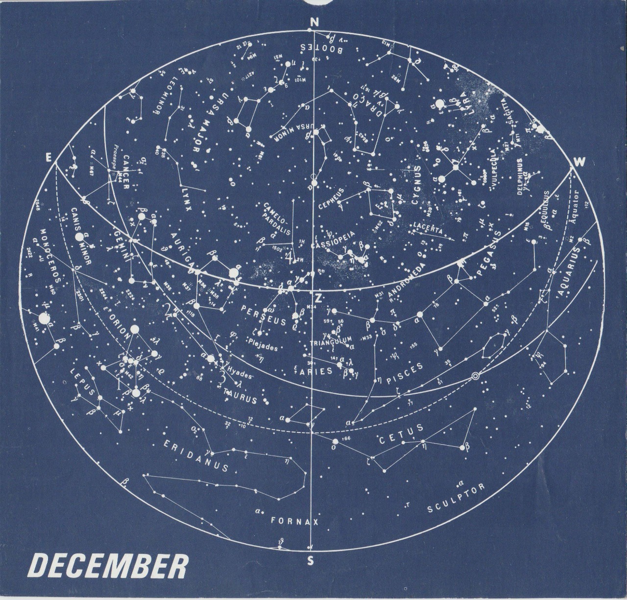 Prosincová obloha nám nabízí spíše pohled na podzimní souhvězdí, které opanují zimní oblohu. Pokud zaměříme pohled jižním směrem, spatříme rozsáhlé souhvězdí Pegase, od něhož na levou stranu vybíhá řada hvězd patřící Andromedě. Jistě Vám nemusím říkat, že můžeme provést zastávku u Velké mlhoviny. Pod Andromedou nalezneme souhvězdí Berana. Zde vyhledáme planetu Jupitera s Uranem. Přejdeme do souhvězdí Trojúhelníku. Od „poloviny“ Andromedy směrem k horizontu se linou Ryby a Vodnář. Kozoroh nad západním obzorem je sotva znatelný. Prohlédneme si planetu Saturna v první polovině noci v souhvězdí Vodnaře. Zajisté spatříme jeho měsíc Titan. Na rozdíl od souhvězdí Kozoroha je sousední Velryba majestátním jižním souhvězdím. Je zřetelná s nejjasnější hvězdou, Deneb Kaitos. Přímo na jihu nám září Fomalhaut – zářící hvězda ze souhvězdí Jižní Ryby.