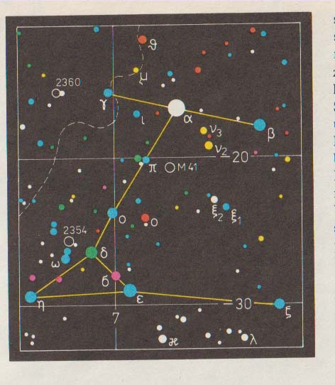 α Sirius, který vystupuje pouze 30°nad obzor.Že ho vidíme jako jasnou hvězdu není způsobeno velikostí ( asi 2 - krát větší jako naše Slunce )nýbrž tím, že je vzdálena pouze 8,69 světelného roku a jedná se o nejbližší hvězdu na severní hvězdné polokouli.Sirius má průvodce bílého trpaslíka 8,65 magnituda. Spatřit ve společnosti hlavní hvězdy je obtížné, protože je osvětlen již zmíněnou hvězdou.Co se týká hmotnosti odpovídá hmotnosti Slunce ,naopak velikostí dosahuje něco málo přes dvě Země.Průměrná hustota je veliká 90 tisickrát větší než hustota Slunce.Na Zemi by 1cm3 jeho látky vážil 125 kg.