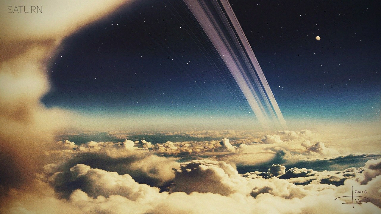 Pohled z největšího měsíce Saturna Titanu na planetu Saturna